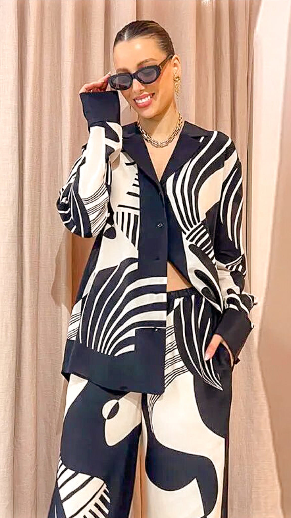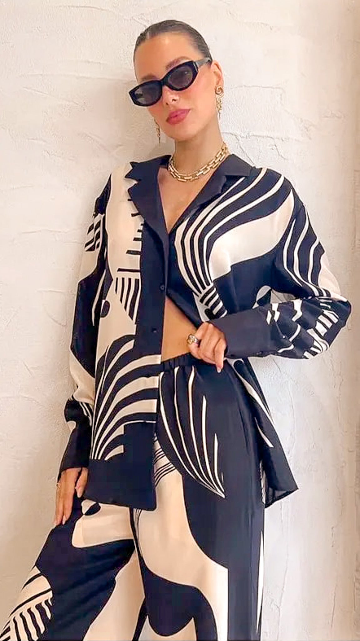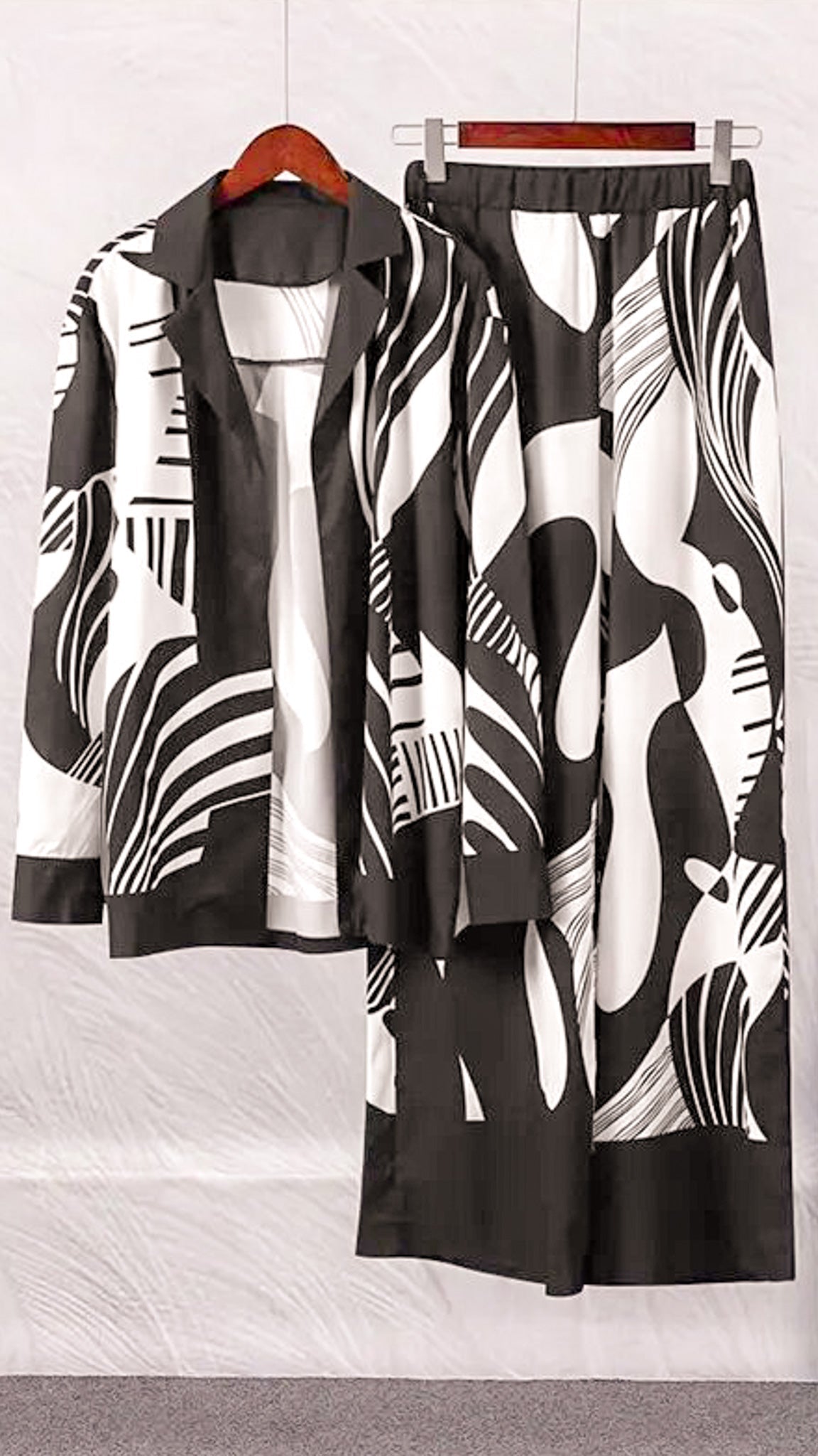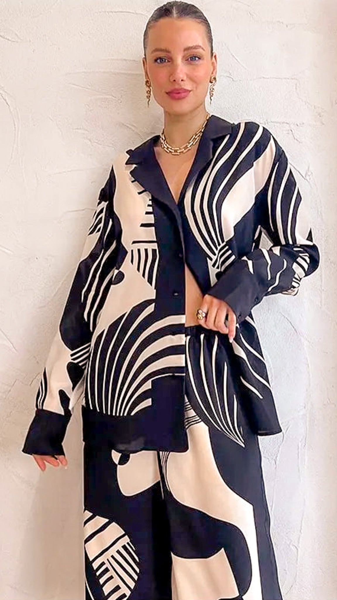 Step out in style with the ultra-comfy Amara Graphic Print Blouse and Pants Set!
