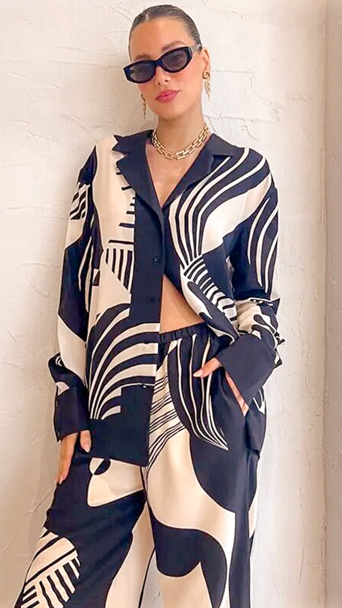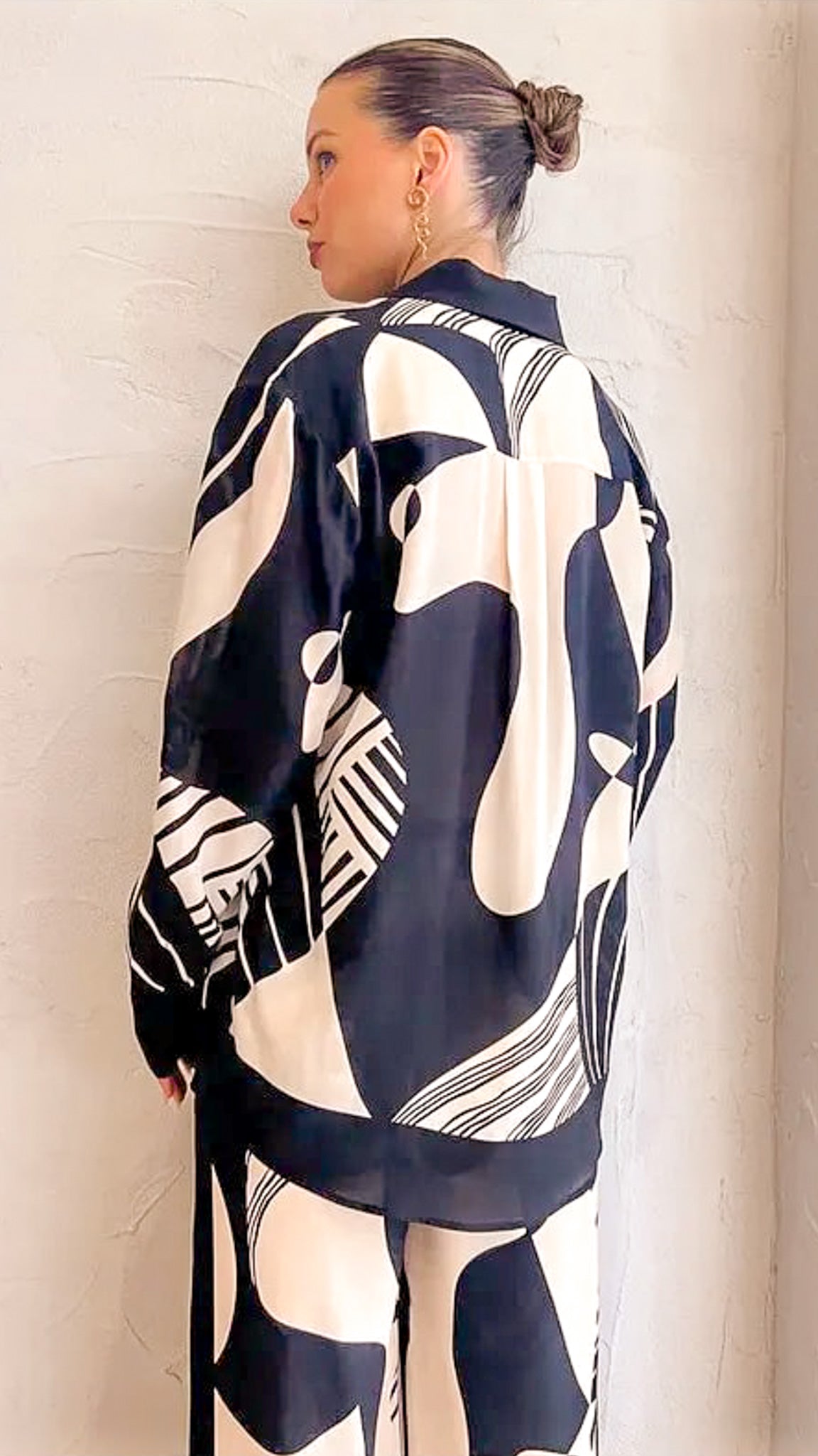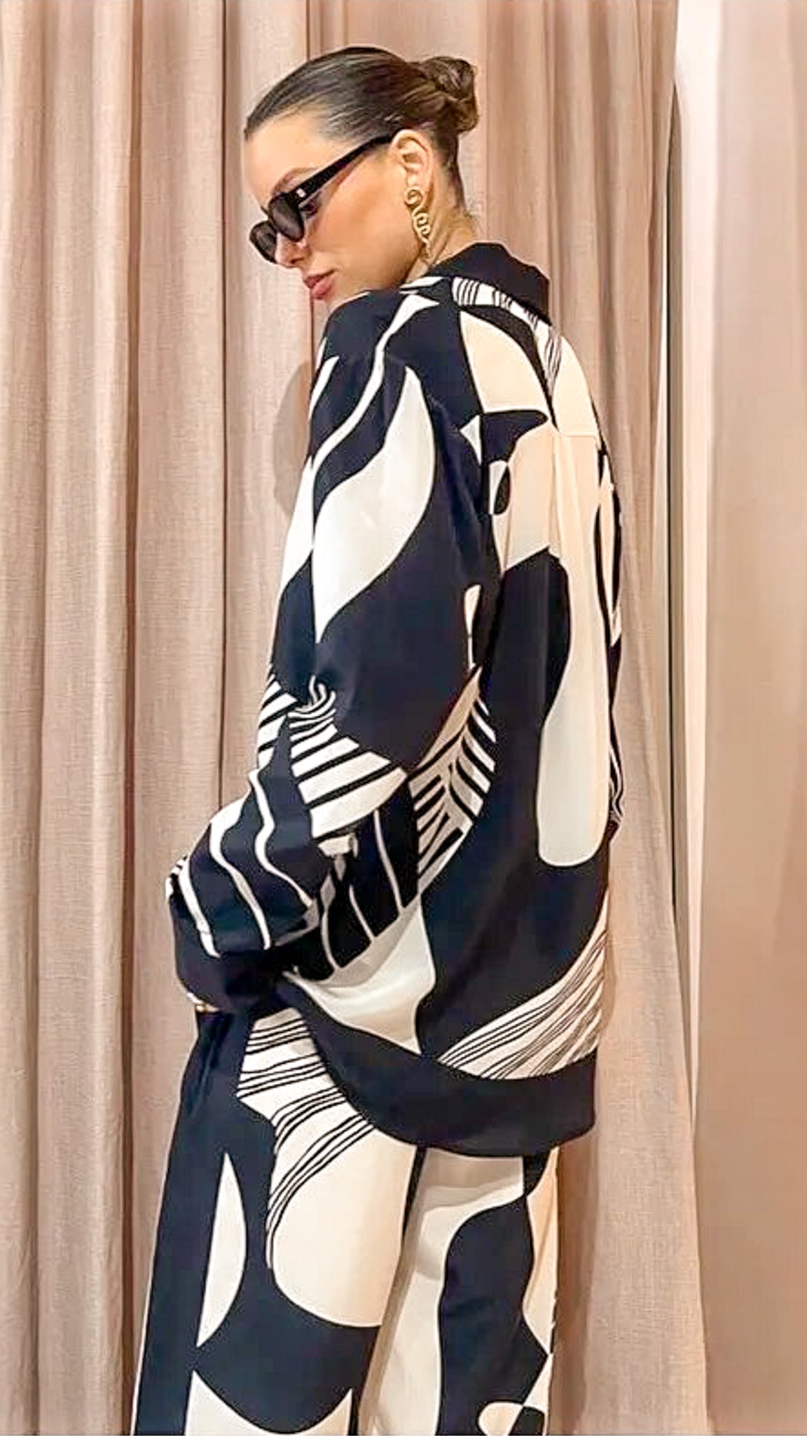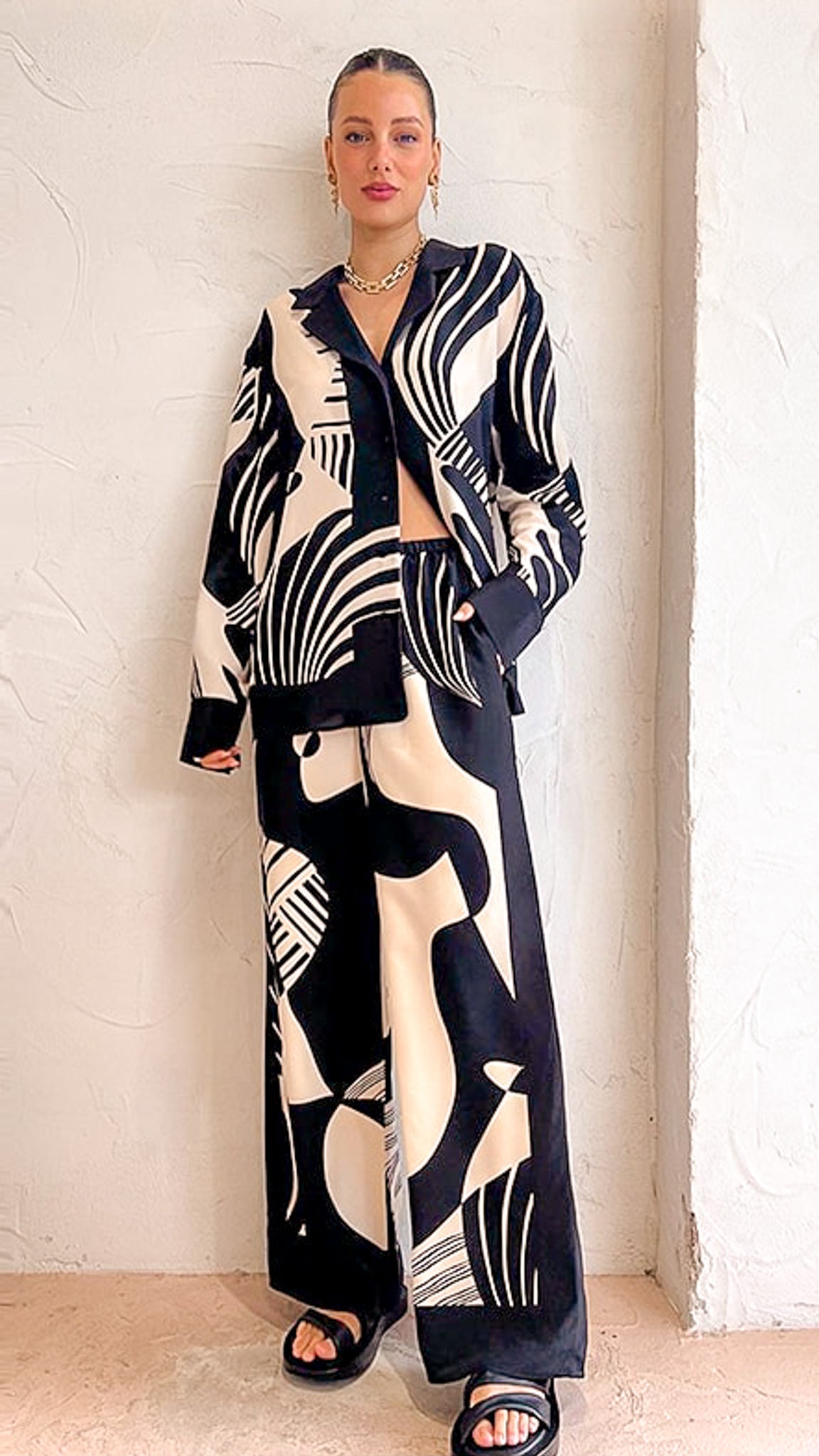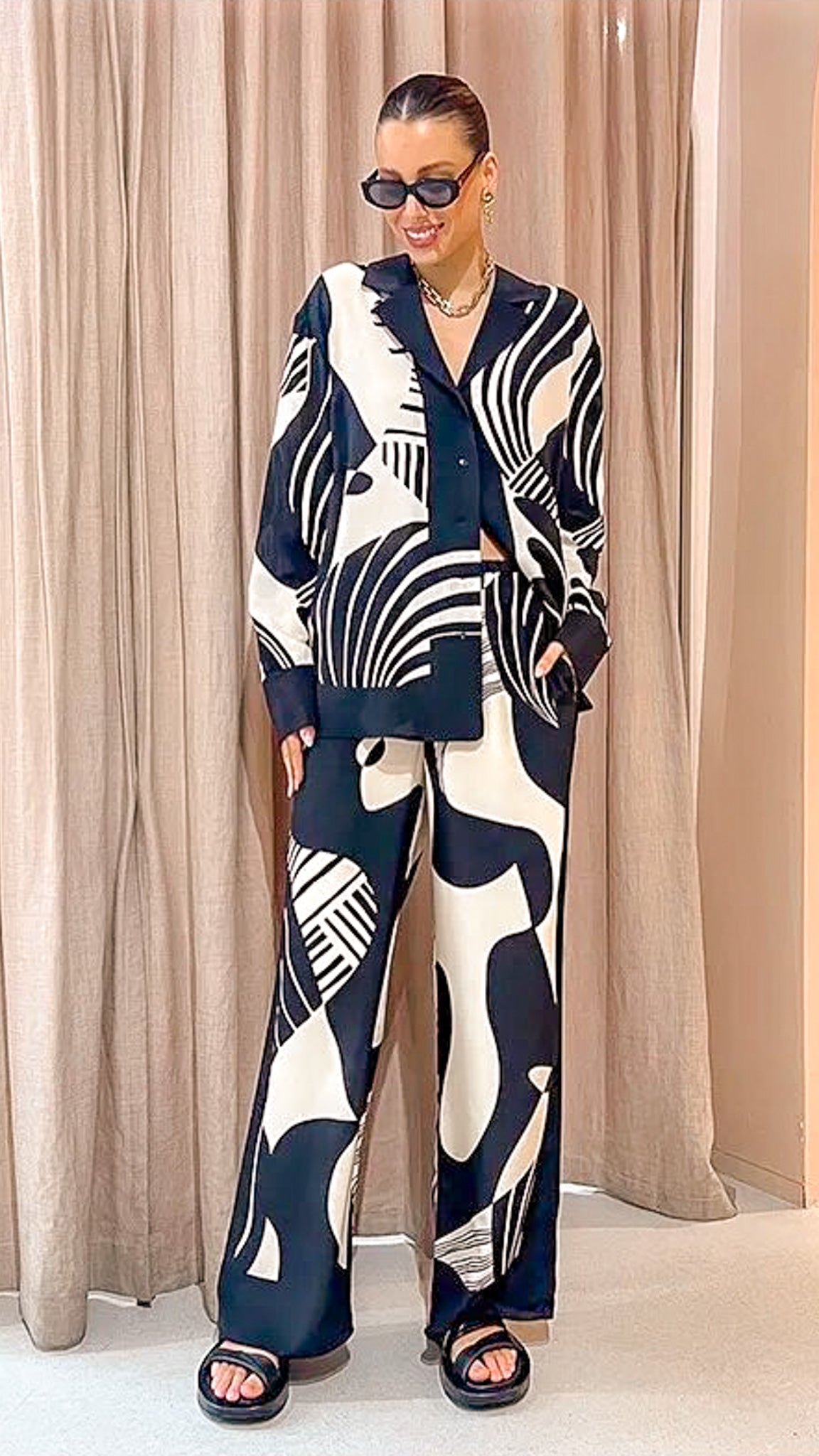 Step out in style with the ultra-comfy Amara Graphic Print Blouse and Pants Set!