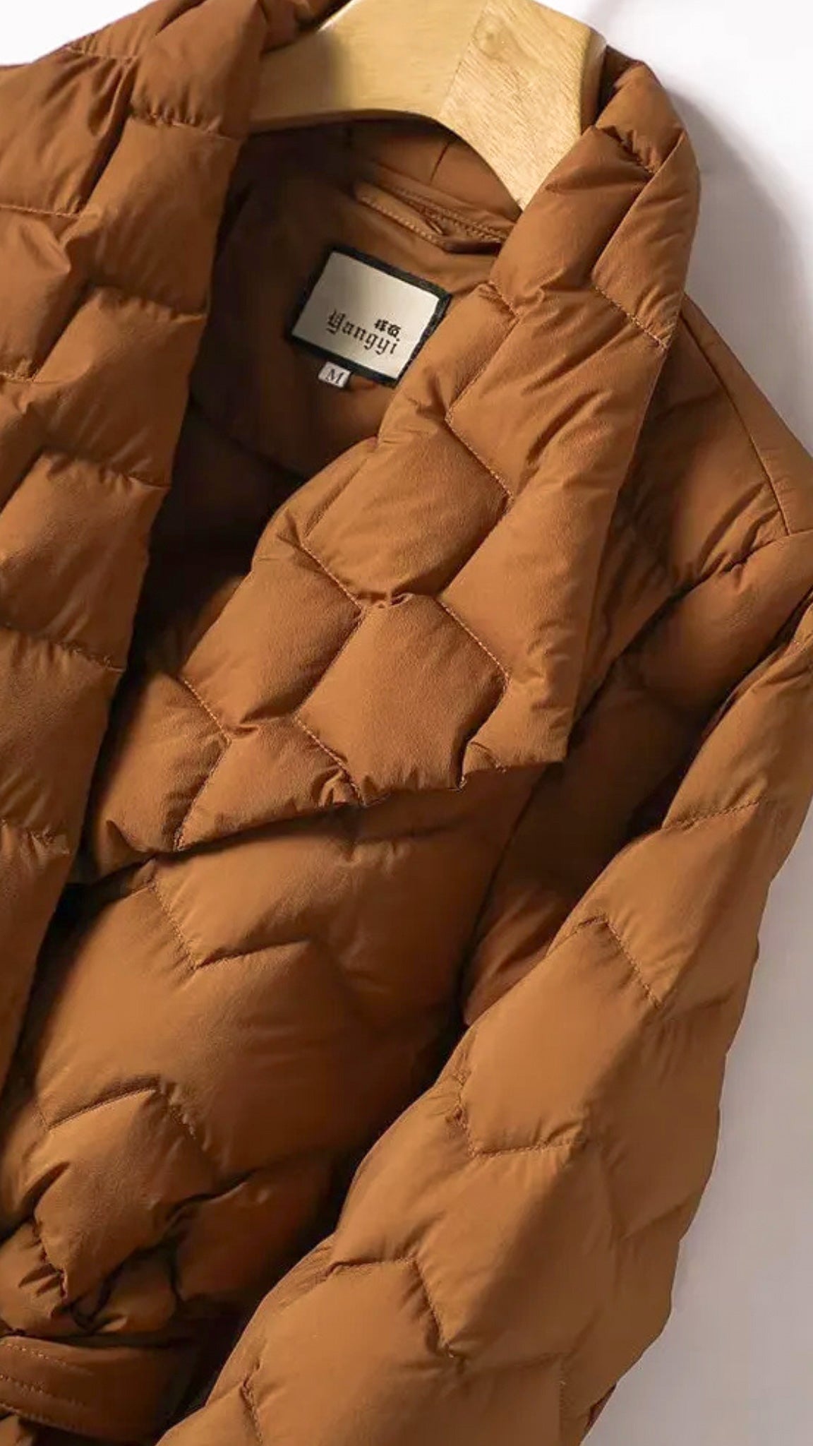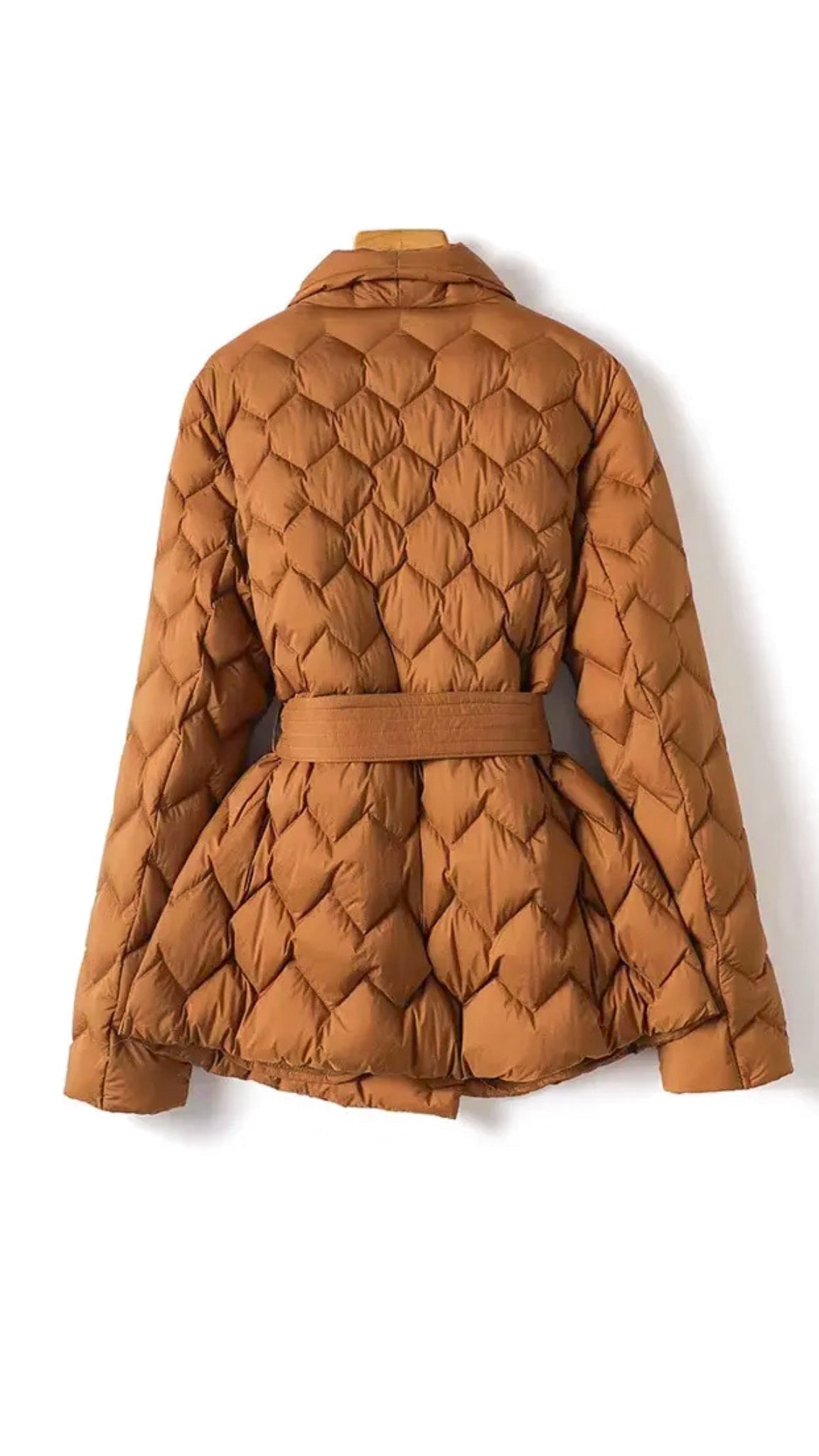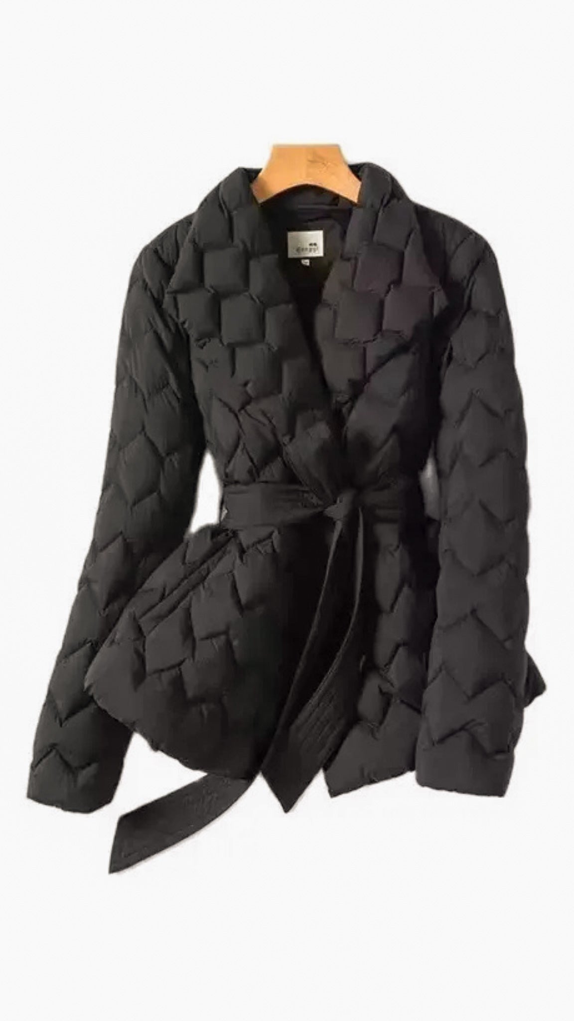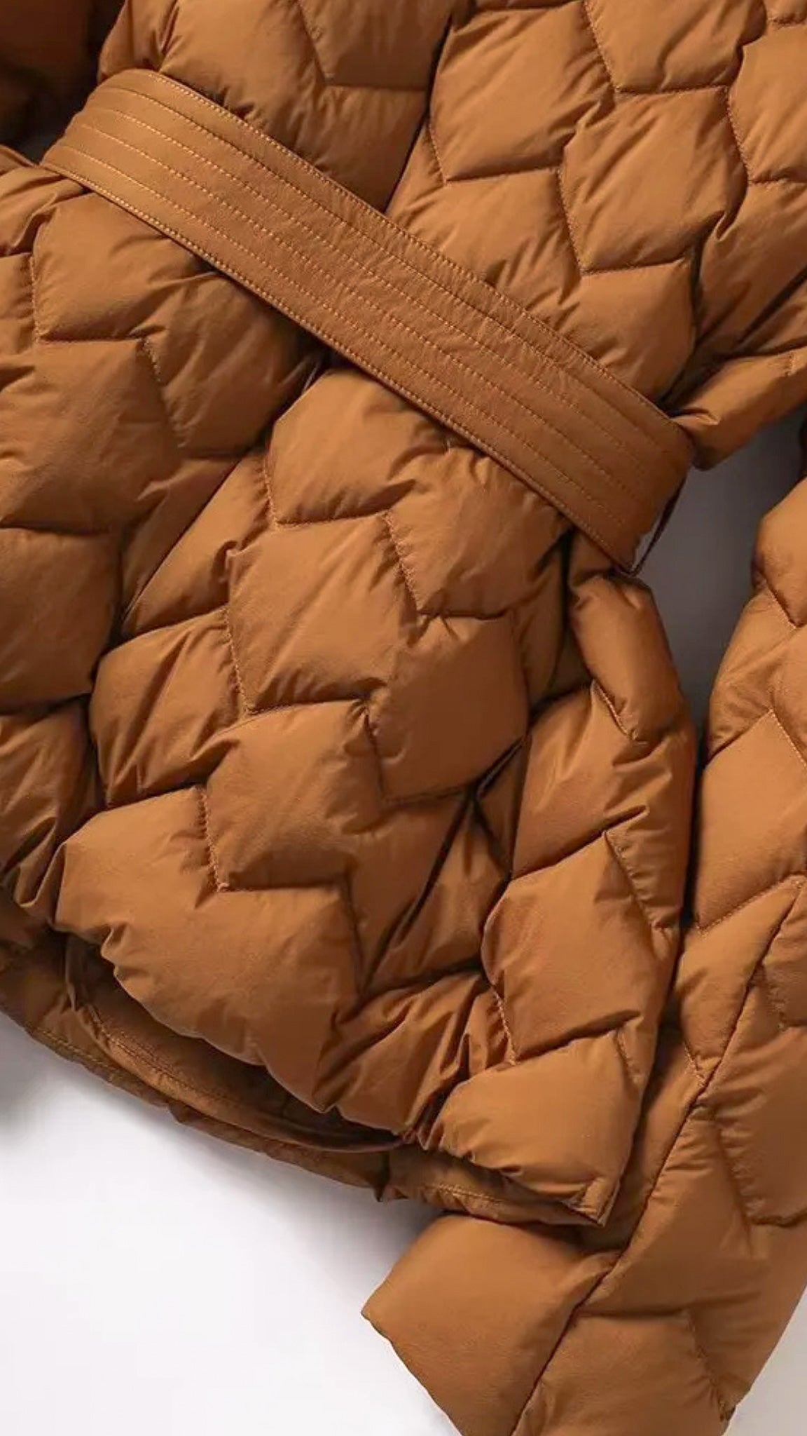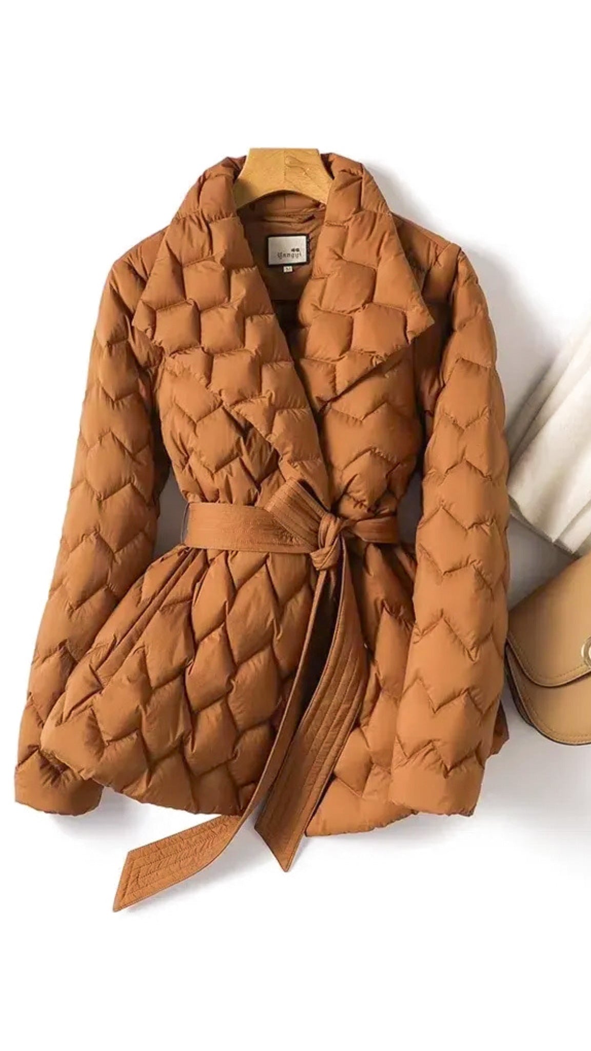 This lightweight coat features a unique diamond-quilted pattern that not only offers exceptional insulation but also adds an elegant, textural appeal. The wrap-around design, complete with a wide, self-tie belt, accentuates your waist, creating a flattering silhouette while keeping you snug. Perfectly crafted for chilly days, the Amber Luxe Puffer combines practicality with sophistication, making it an essential addition to your winter wardrobe. Choose between classic black and rich caramel tones for a chic, versatile look.