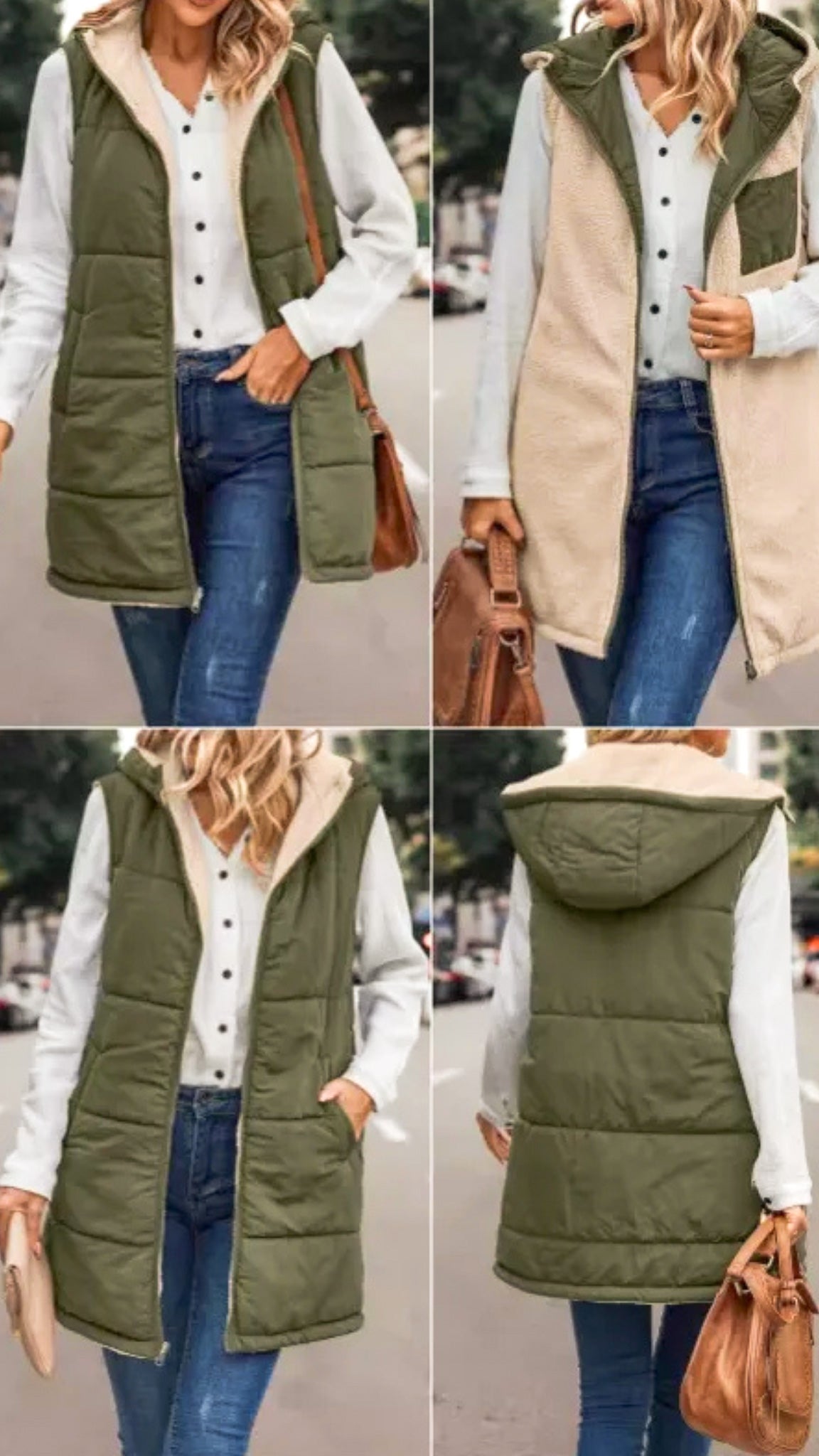 This reversible vest is designed to be worn two ways, offering a choice between a smooth, chic exterior and a plush, sherpa-lined inner. With a cozy hood and deep pockets, it’s perfect for those chilly days when style and warmth are both a priority. The relaxed fit and easy zip-up design make it a seamless addition to any outfit, whether you’re on the go or layering up for a weekend adventure.