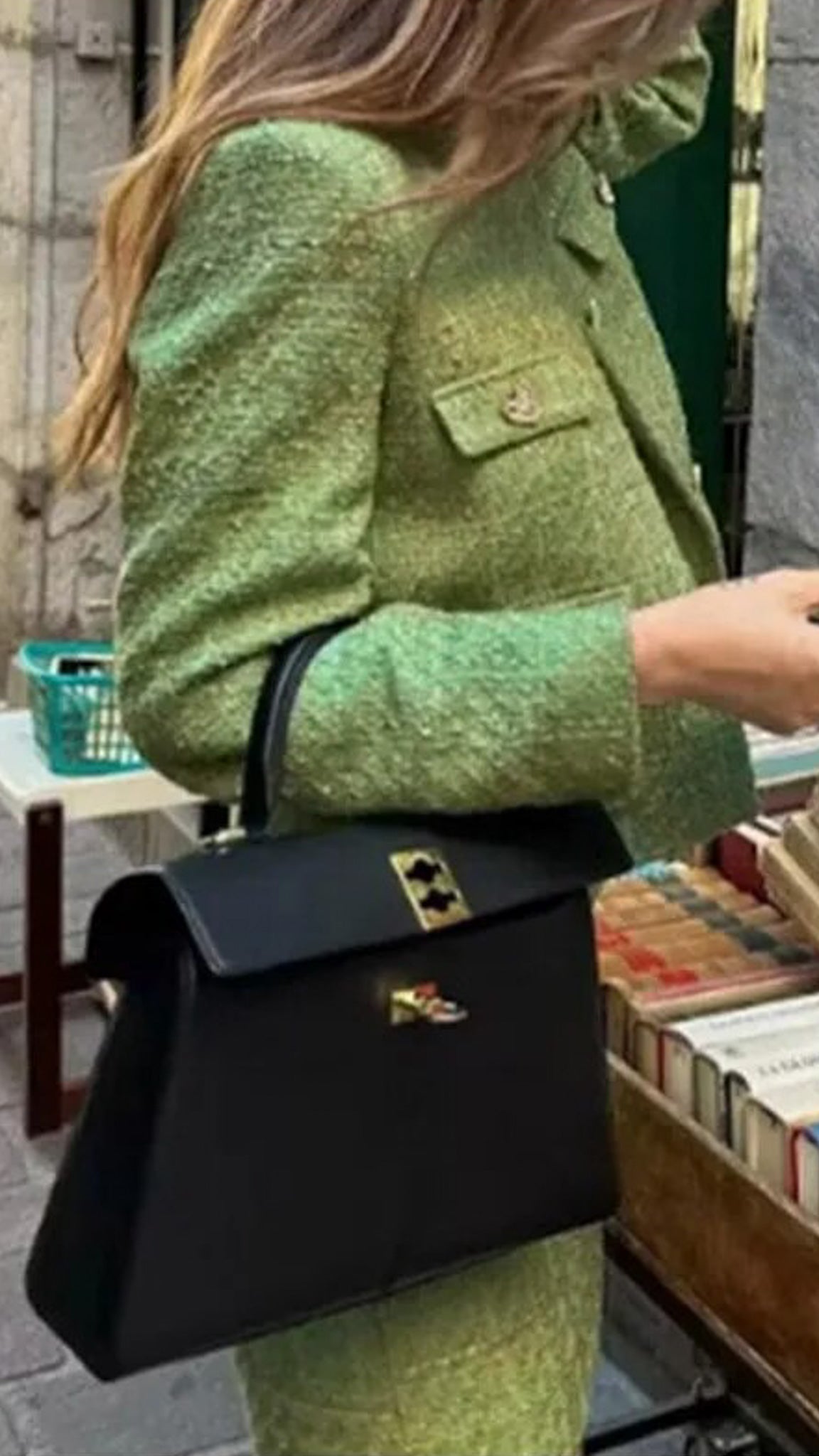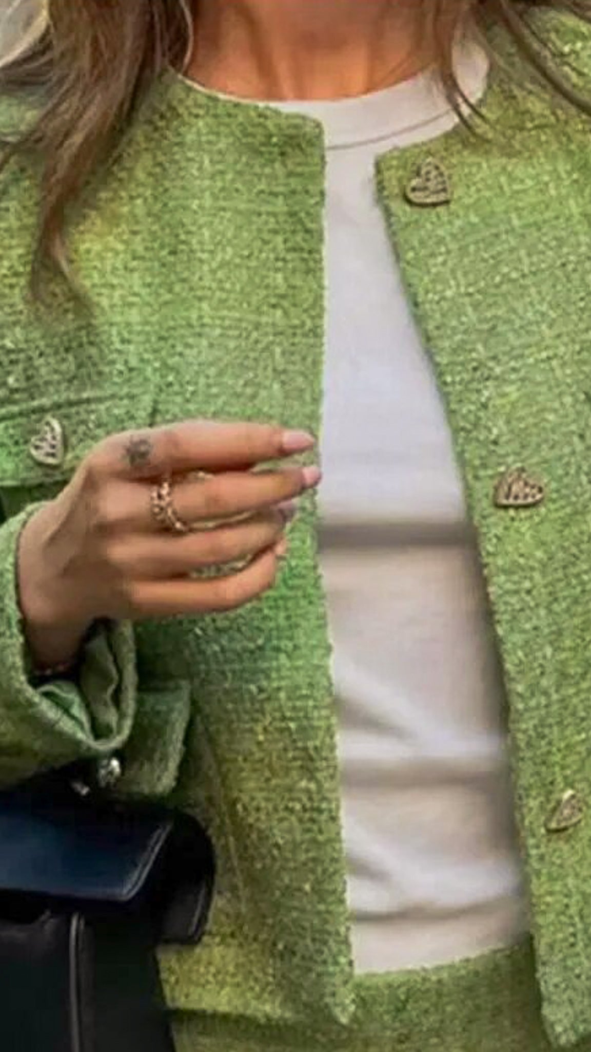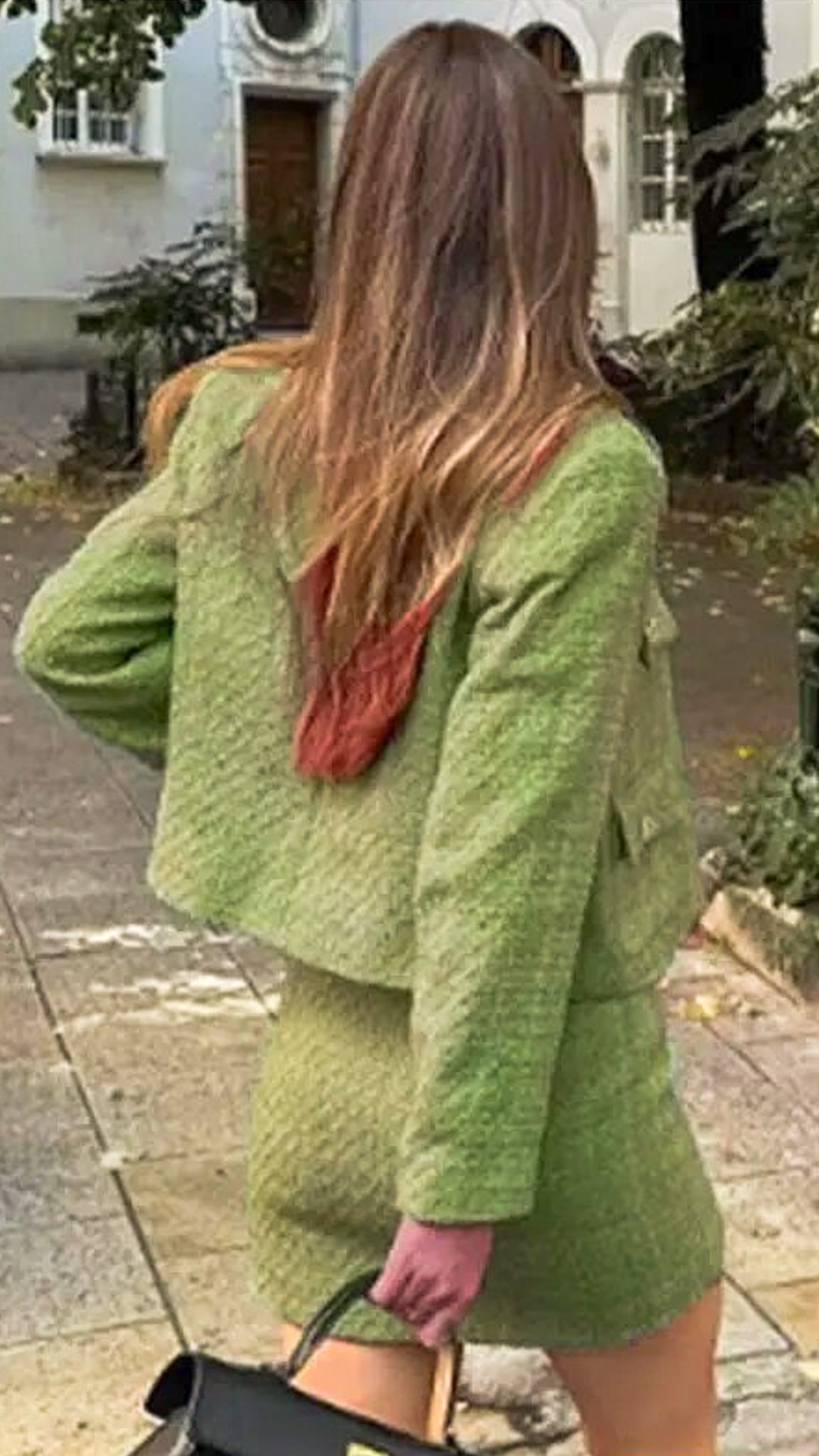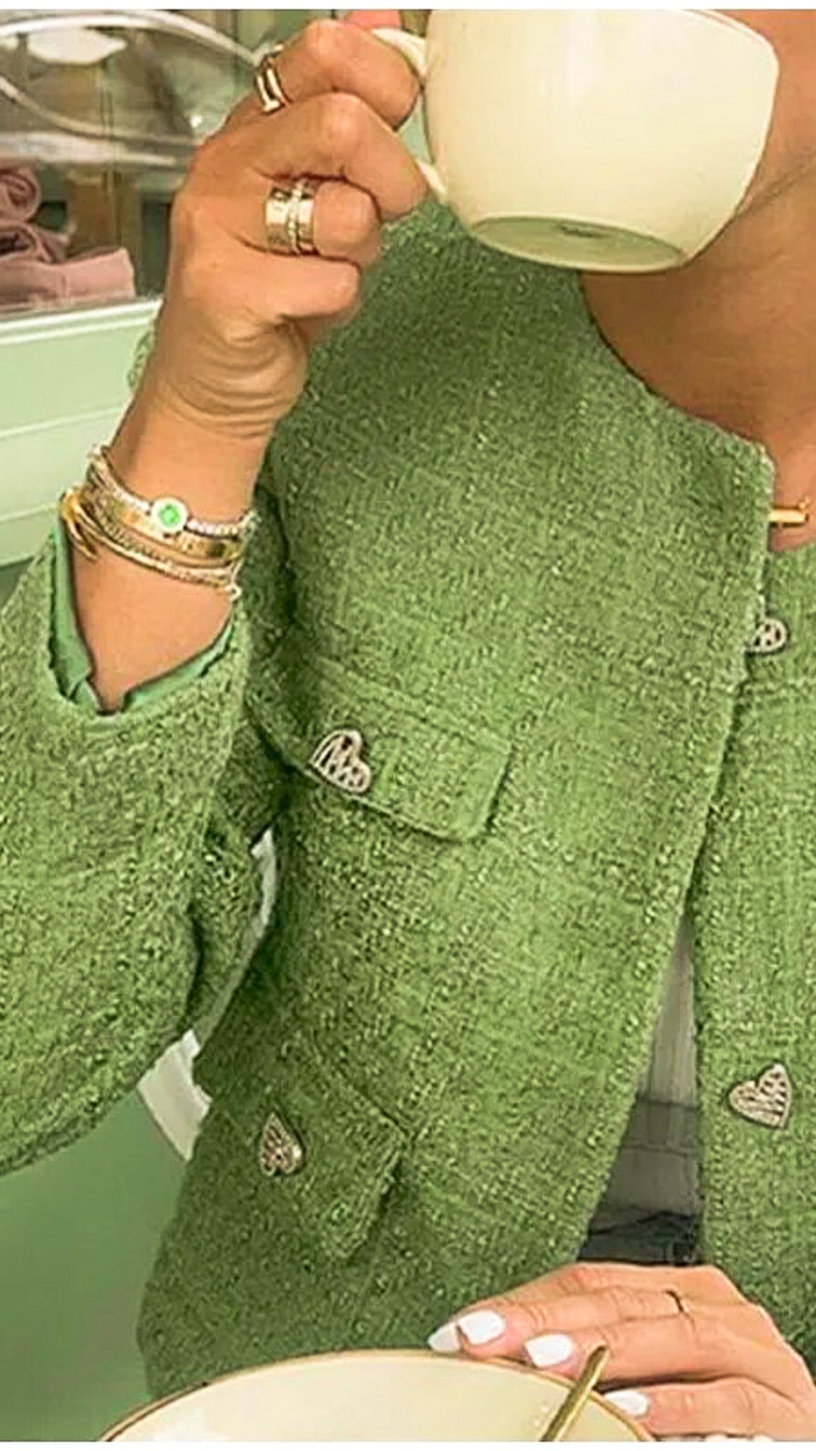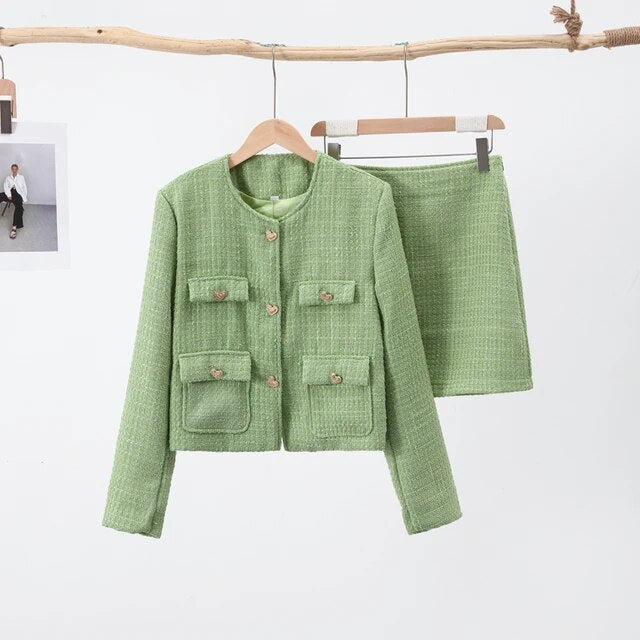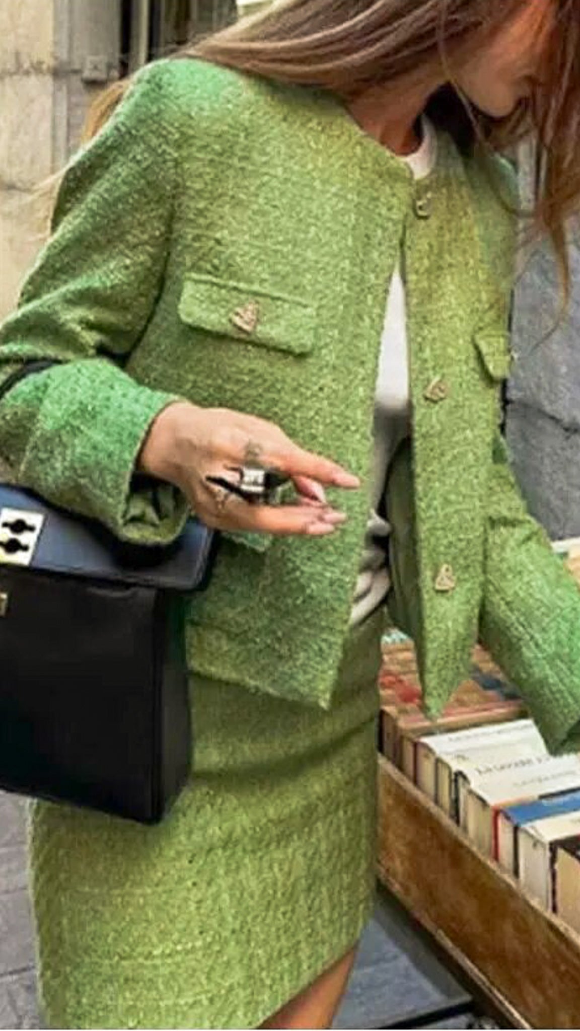 The luxurious look of tweed is updated in a modern olive green shade, giving you the perfect office lady look for any occasion. Make a fashion statement with this stunning two-piece set!
