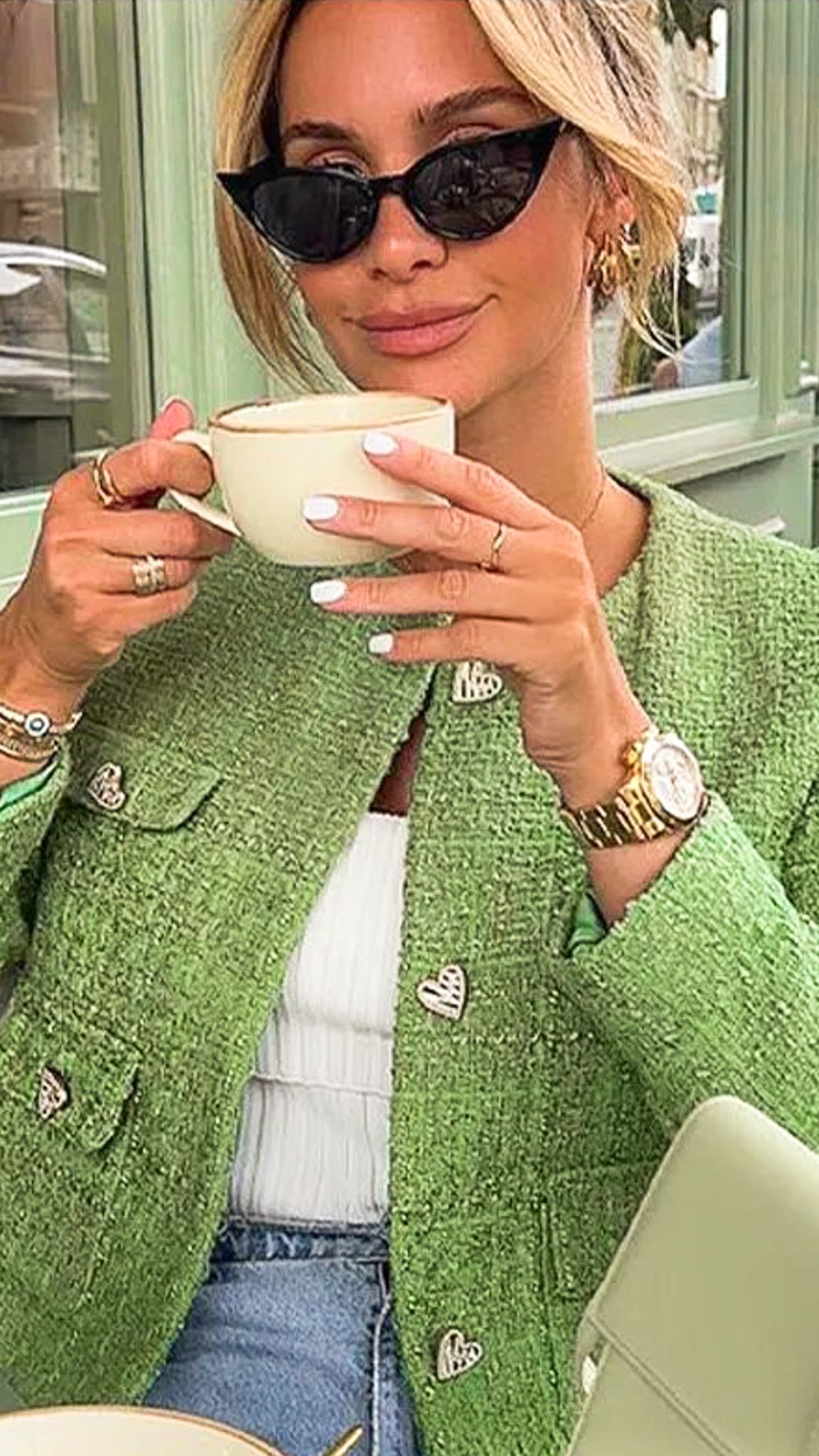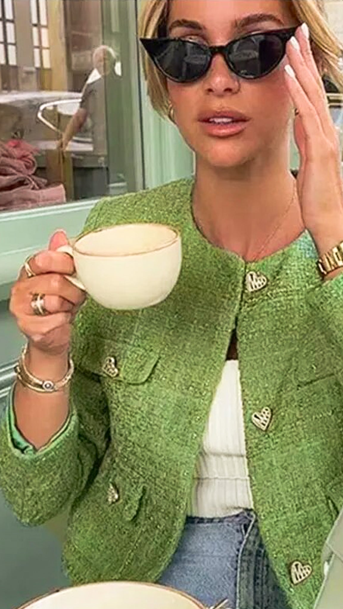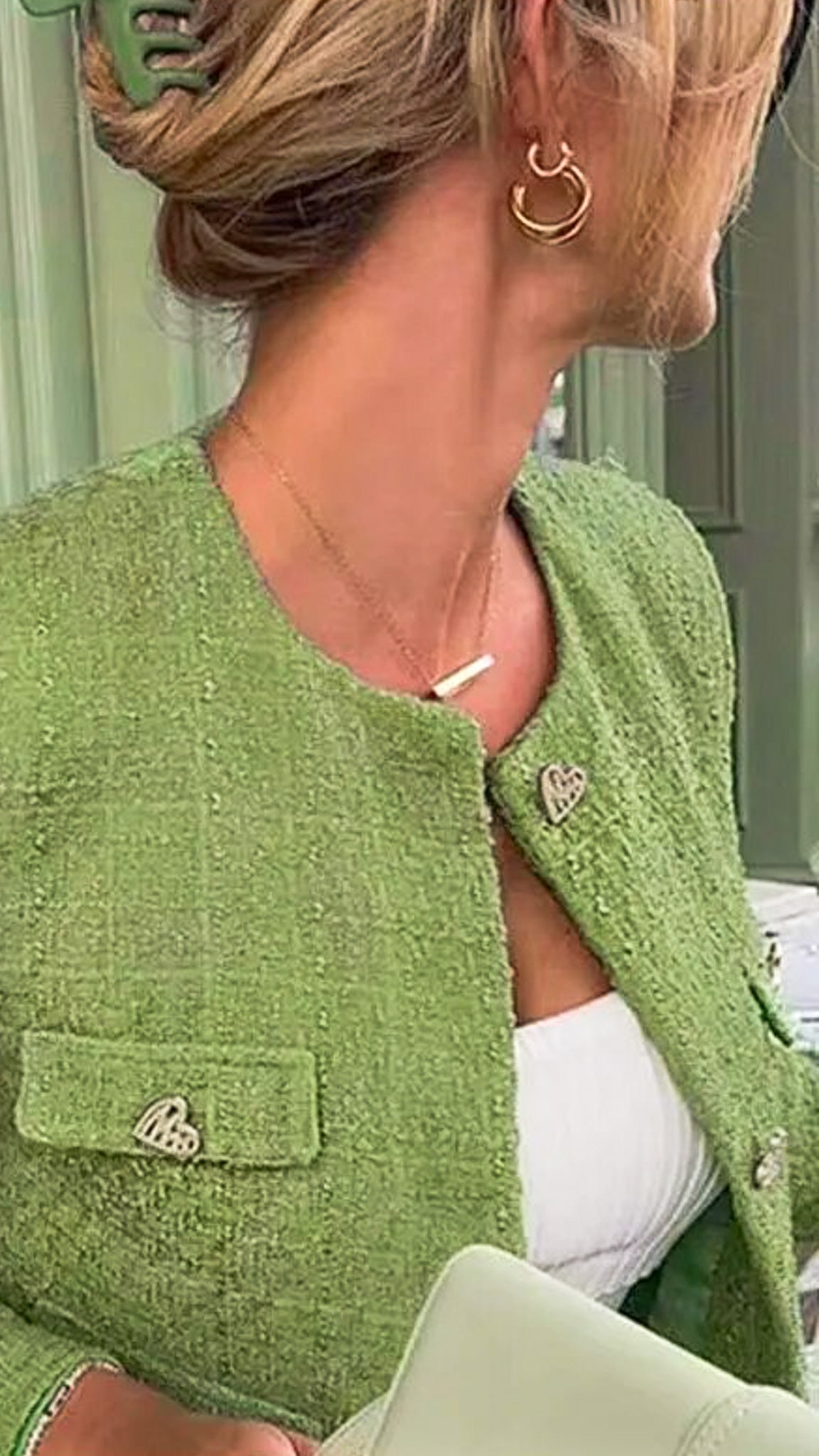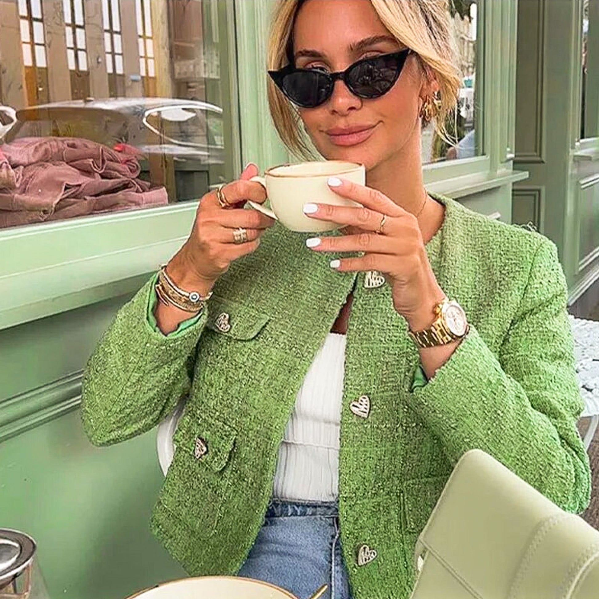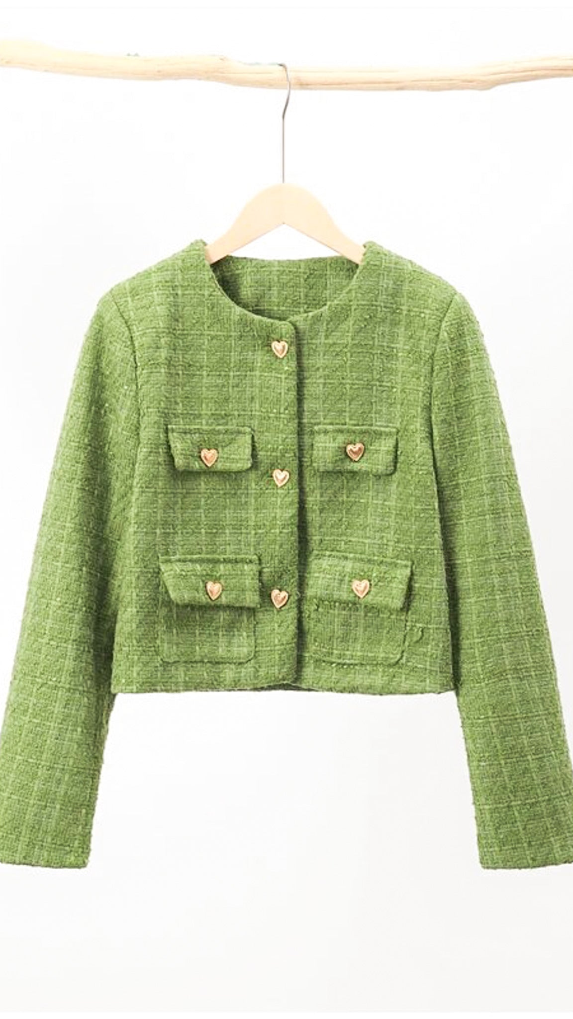 The luxurious look of tweed is updated in a modern olive green shade, giving you the perfect office lady look for any occasion. Make a fashion statement with this stunning two-piece set!