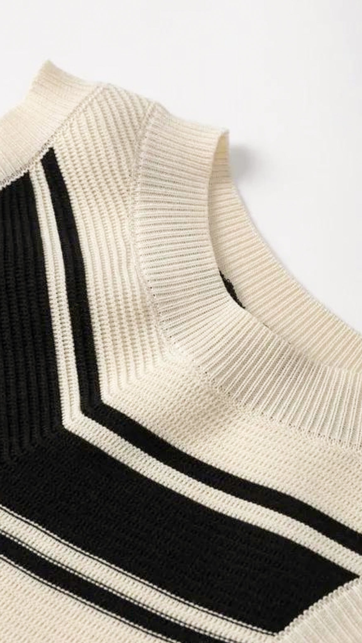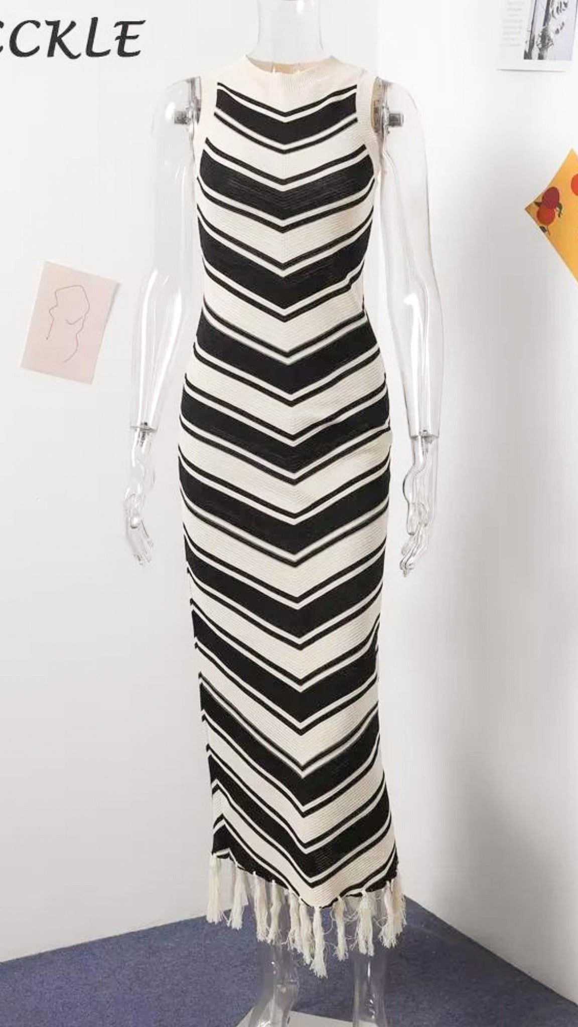 Vibrant chevron stripes and playful tassel fringe make this midi dress stand out. The sleeveless design and high o-neck add a touch of sophistication, while the high quality knit elevates the overall look. Perfect for pairing with your favorite boots or heels for any occasion.
