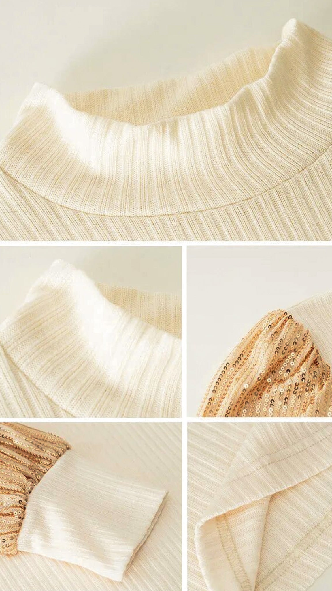 The sequin sleeves add unexpected bling to this knitted turtleneck pullover, making it a stylish and versatile choice. Pair it with shorts, jeans, or pants for a trendy and eye-catching look.
