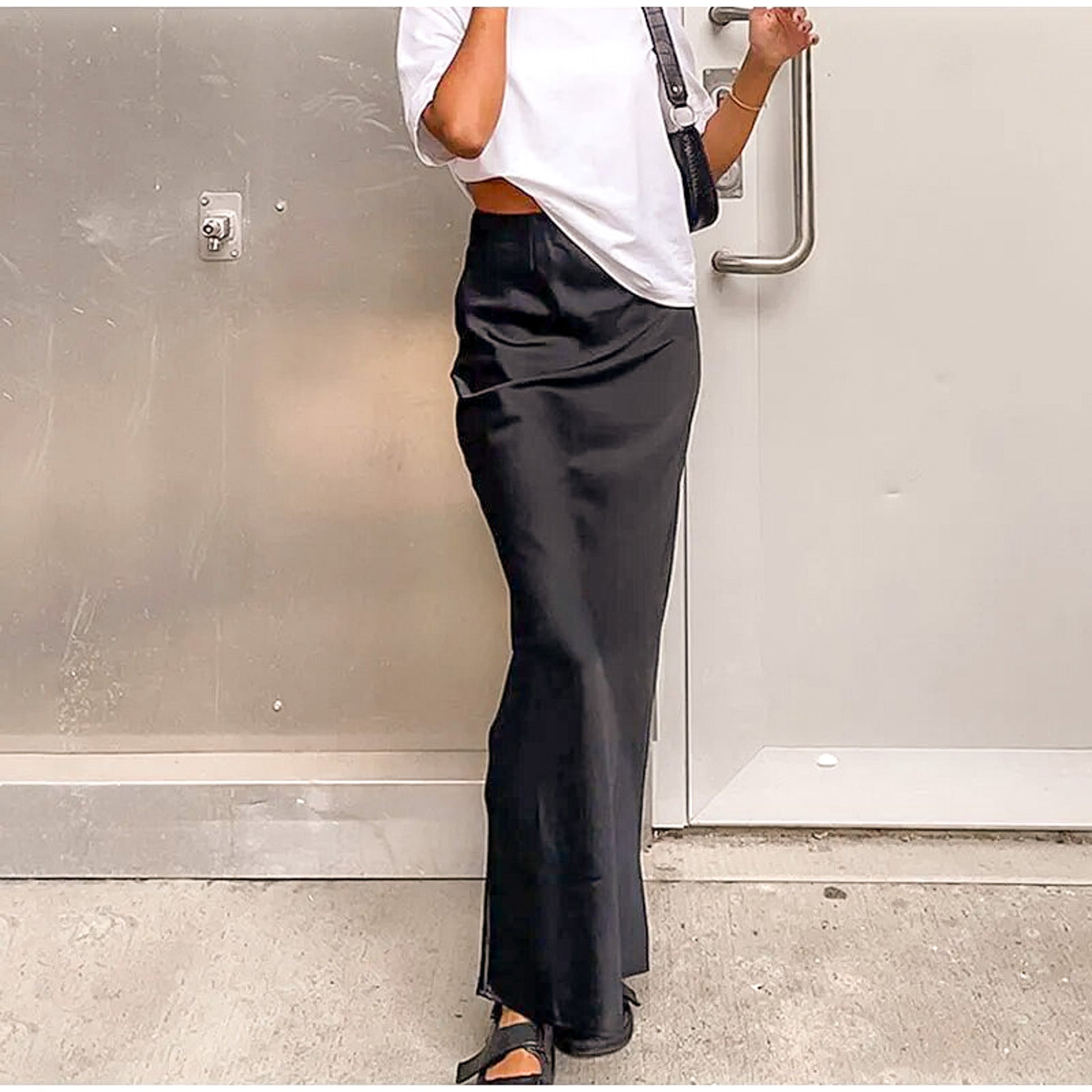 Crafted from luxurious satin, this maxi skirt gently flares out from the hip, giving you a chic and flowy look. Complete your look with a cropped top and strappy heels for a stunning head-to-toe ensemble.