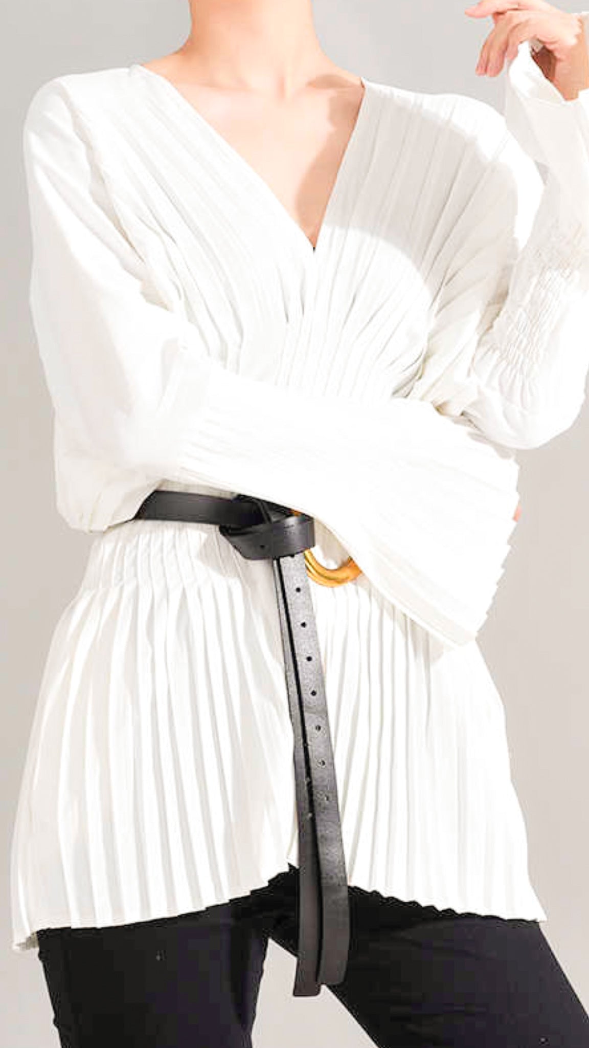 Its unique design features a v-neck, tapered waistline, and flare long sleeves, bringing a touch of sophistication to any occasion. The pleated fabric, impeccable stitching, and intricate detailing ensure a high-quality product. Choose between a knee-length dress or a long blouse that pairs perfectly with dark colored pants, and add a statement belt for a bold finishing touch. Elevate your style with the Mia Pleated Dress today!