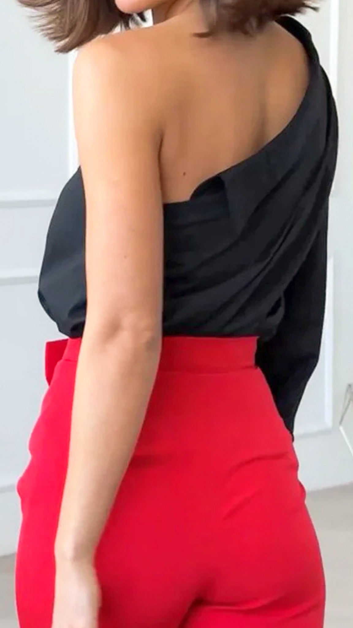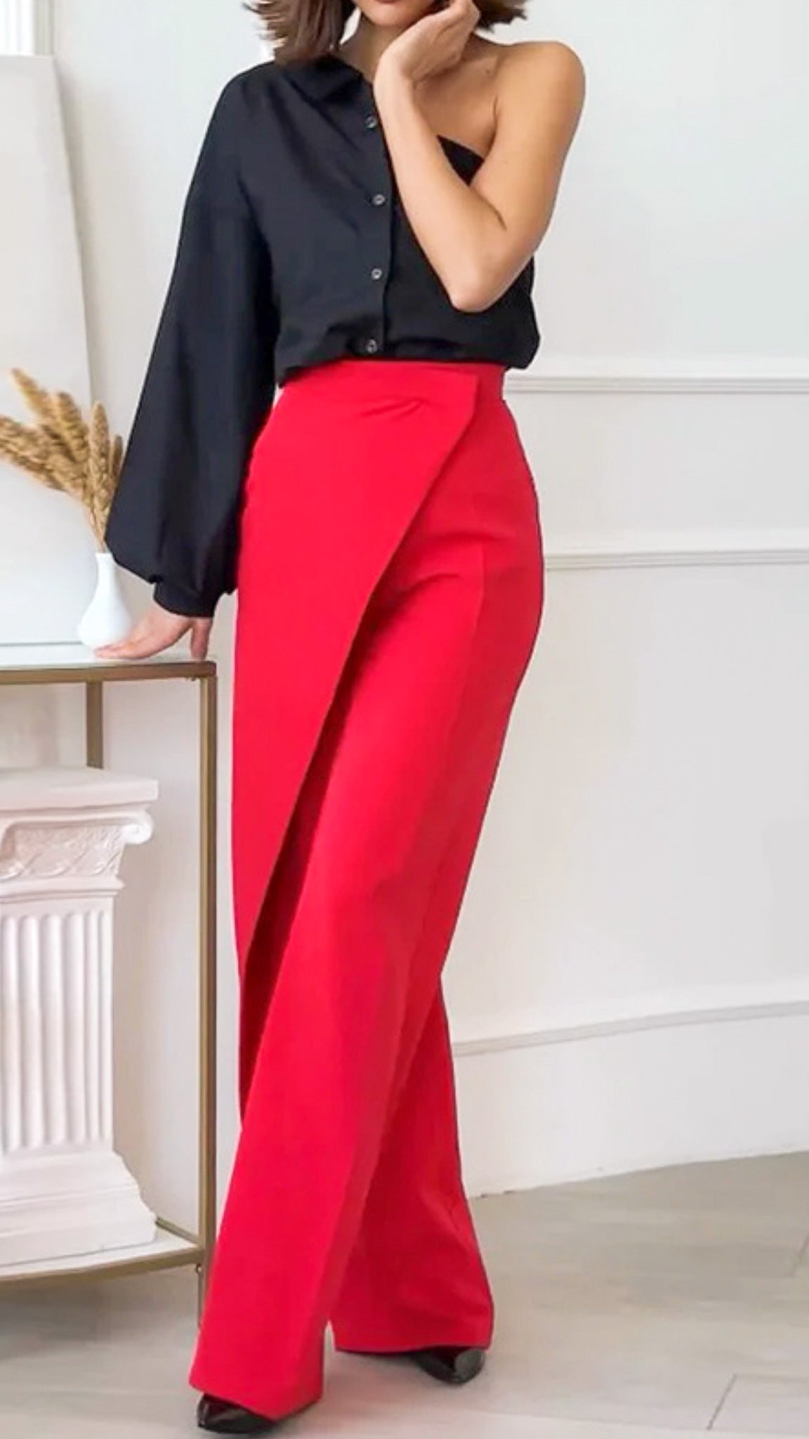 The striking black one-shoulder blouse, with its long puffed sleeve and button down design, pairs perfectly with the high-waisted red pants, adding a touch of asymmetry. Elevate your style and make a statement with this bold and elegant outfit.